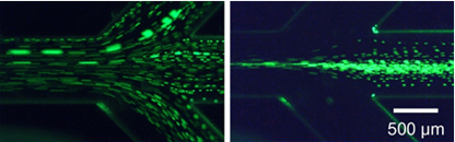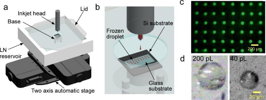 秋山研究室では,世界で初めて超瞬間的に細胞を凍結することで,凍結保護剤を利用しない細胞の凍結保存に成功しました。従来,凍結工程で発生する氷晶(氷の小さい粒)が細胞にダメージを与えるため,凍結保護剤を添加し氷晶を抑制しガラス化状態に持っていく必要がありました。しかし,この凍結保護剤には一般に細胞毒性があるなど凍結保護剤無添加の凍結保存技術の開発が望まれていました.理論的には,細胞を毎秒一万度を超える冷却速度で凍結すれば,結晶が生成する前にガラス化できるだろうことが予想されていましたが,技術的に困難でした.そこで,サイズを小さくすることでより急速に凍結することができるというスケール効果に着目し,インクジェット技術を用いて細胞を40 pL(1ピコリットル = 10-12リットル )の微小液滴として凍結する技術を開発しました.その結果,細胞内の水はガラス化し,凍結保護剤不要の凍結保存法の開発に成功しました。本手法の有用性は,マウス繊維芽細胞NIH 3T3等の細胞株および初代培養細胞であるラット間葉系幹細胞を用いて確認済みです。現在は,凍結保存できないサンプルへの凍結保存実現に向けて本手法の改良を進めると共に,本手法の実用化に向けた研究を進めています。